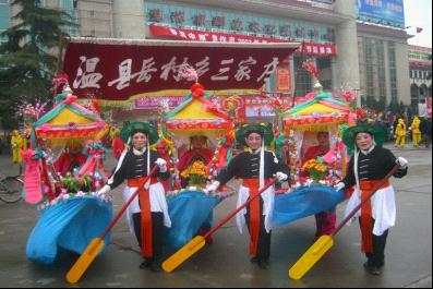 旱船舞在(zai)比较固定的(de)場(chang)地演出时,往往还要根据扮演的(de)戏目(mu)。2009年(nian)春節(jie)三傢(jia)庄村旱船参加(jia)焦作(zuò)優(you)秀民(mín)间文(wén)艺演出,河南(nan)省农民(mín)艺術(shù)傢(jia)、温县怀梆研究会会長(zhang)原三傢(jia)庄村的(de)支部(bu)书记原树武,75岁的(de)老人(ren)把省非(fei)物(wù)質(zhi)文(wén)化遗産(chan)名(míng)录怀梆曲牌象唱戏一(yi)般溶入了(le)旱船舞演出中(zhong)進(jin)行演唱,使人(ren)耳目(mu)一(yi)新(xin)。